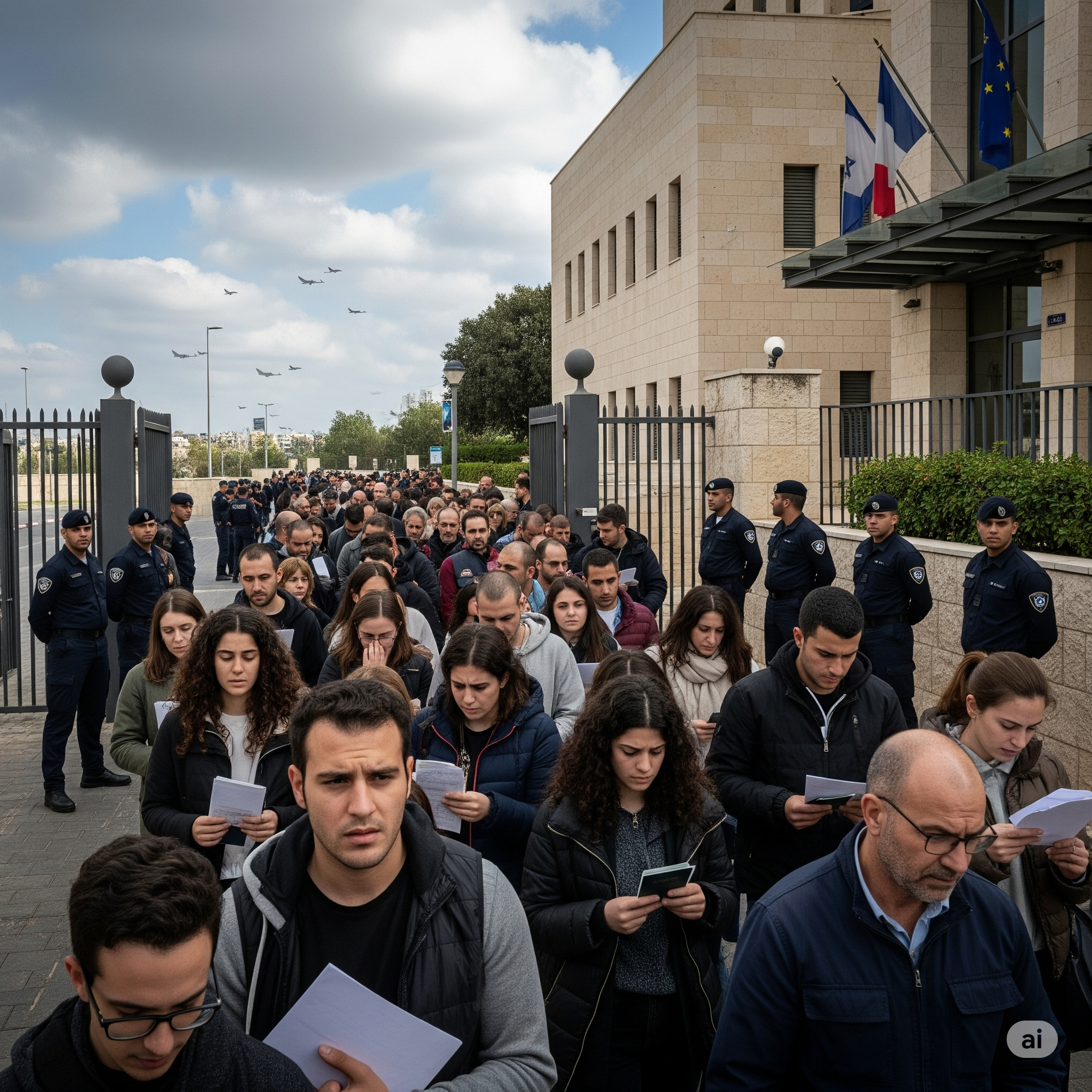 Airplanes pass over Tel Aviv. Sirens rise and fall, but no one moves. If a rocket falls here, it falls. The only exit ticket sits at the end of the line, with the scowling clerks who would very much prefer to be in Paris but are condemned, in the name of “public service,” to shut themselves inside the embassy.